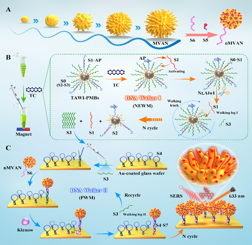 针对以上挑战,万象城娱乐allwincity体育化学院周宏教授团队、何鹏副教授在Small(IF=13)上发表了题为“Engineering Assembly of Plasmonic Virus-Like Gold SERS Nanoprobe Guided by Intelligent Dual-Machine Nanodevice for High-Performance Analysis of Tetracycline”的研究。该研究设计了一种新型的双机联动纳米器件(DMLD)。以挂锁适配体组件作为启动指挥中心,核酸编码的类病毒多刺突金纳米粒子(nMVANs)作为信号指示器,级联步行者电路作为处理器,实现了对TC的高性能分析。MVAN 中刺突顶点和刺突间纳米间隙的存在促进了强烈的电磁近场聚焦,为nMVAN的高SERS活性提供了保障。而且,通过多级Walker催化电路之间的顺序激活,DLMD系统能够将有限的TC识别转化为DNA扩增子引导的SERS探针的大规模工程化组装,从而实现全域等离子体热点的协同增强。高活性仿生探针和多机模块化设计的精巧结合这一构建理念凸显了智能纳米器件在分析环境和食品中的痕量危害物方面的巨大应用潜力。